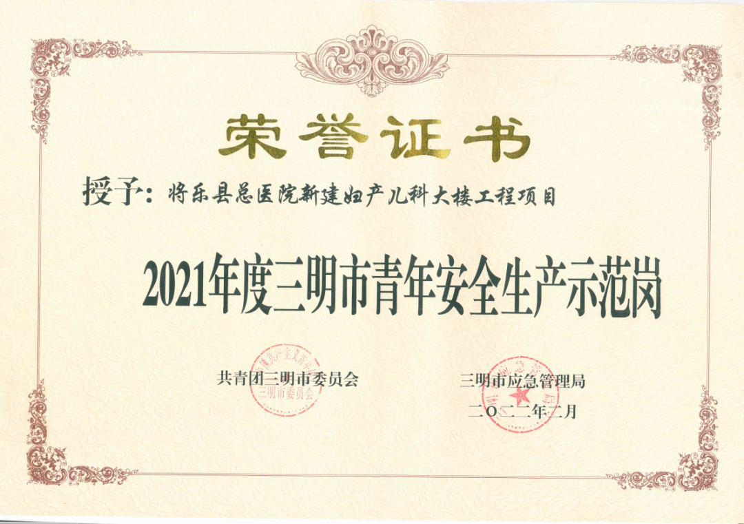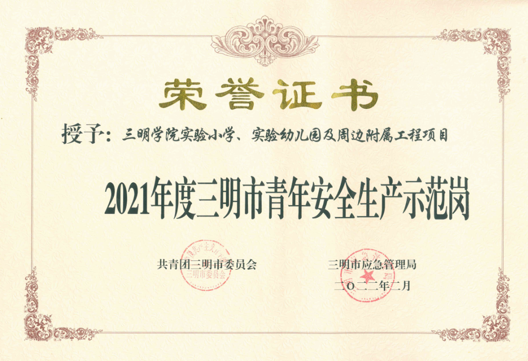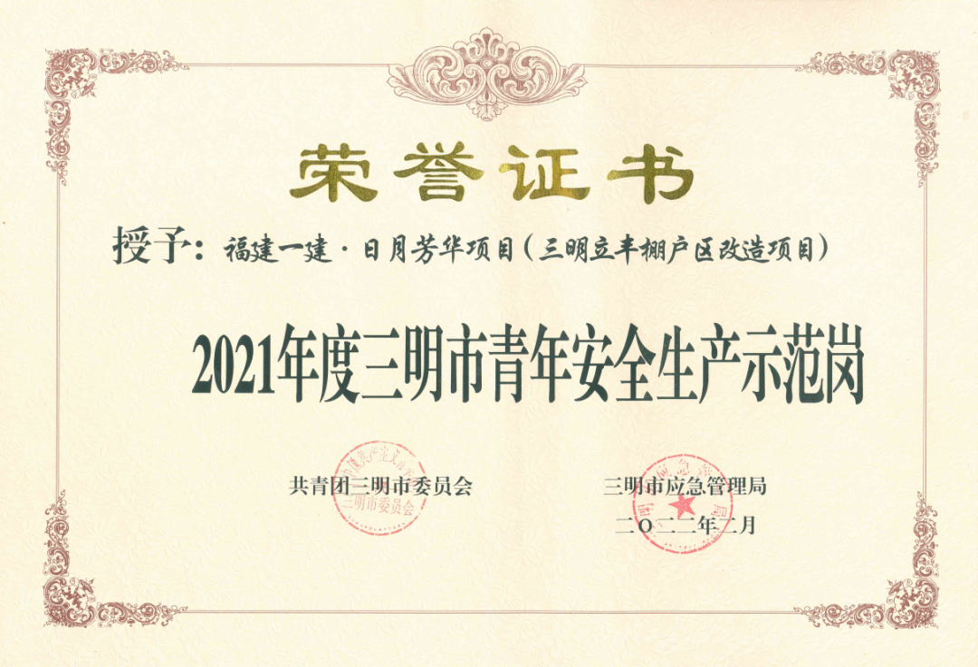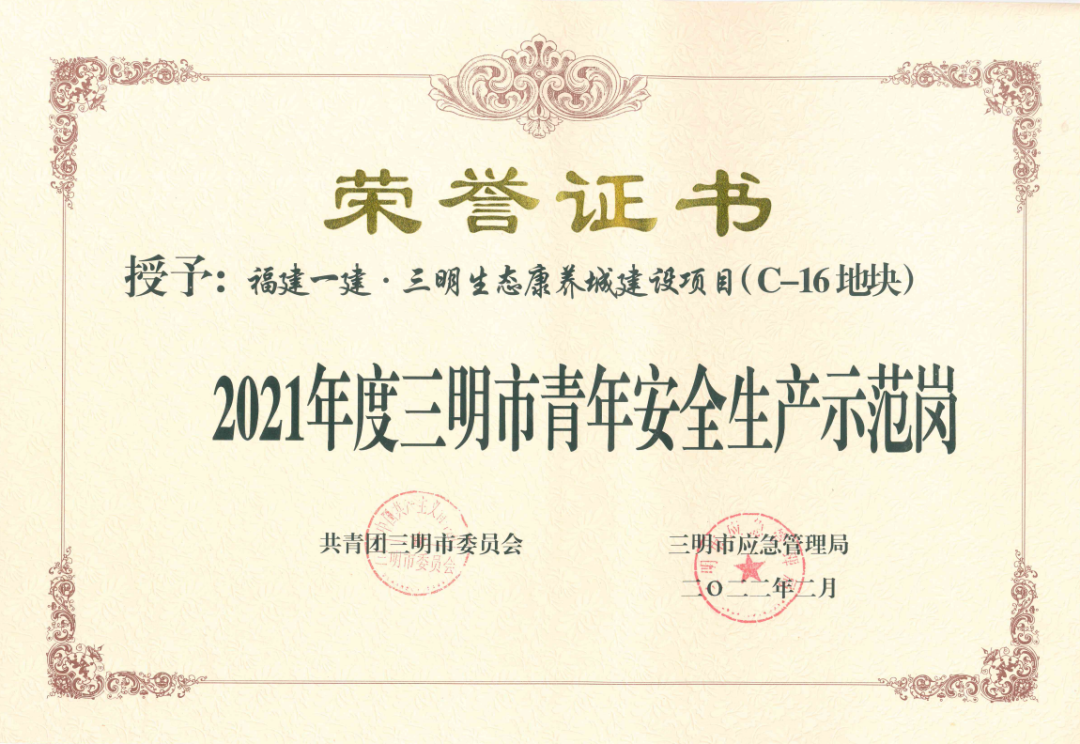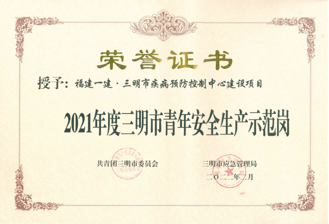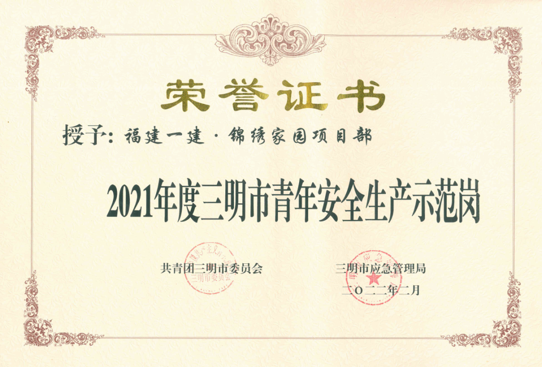 近日,共青团三明市委员会、三明市应急管理局发文认定2021年度三明市青年安全生产示范岗,福建一建火必注册官网2021年度创建青年安全生产示范岗的6个项目均列榜中,分别是三明生态康养城建设项目(C-16地块)、锦绣家园项目、日月芳华项目、三明学院实验小学实验幼儿园及周边附属工程项目、三明市疾病预防控制中心项目、将乐县总医院新建妇产儿科大楼工程项目。