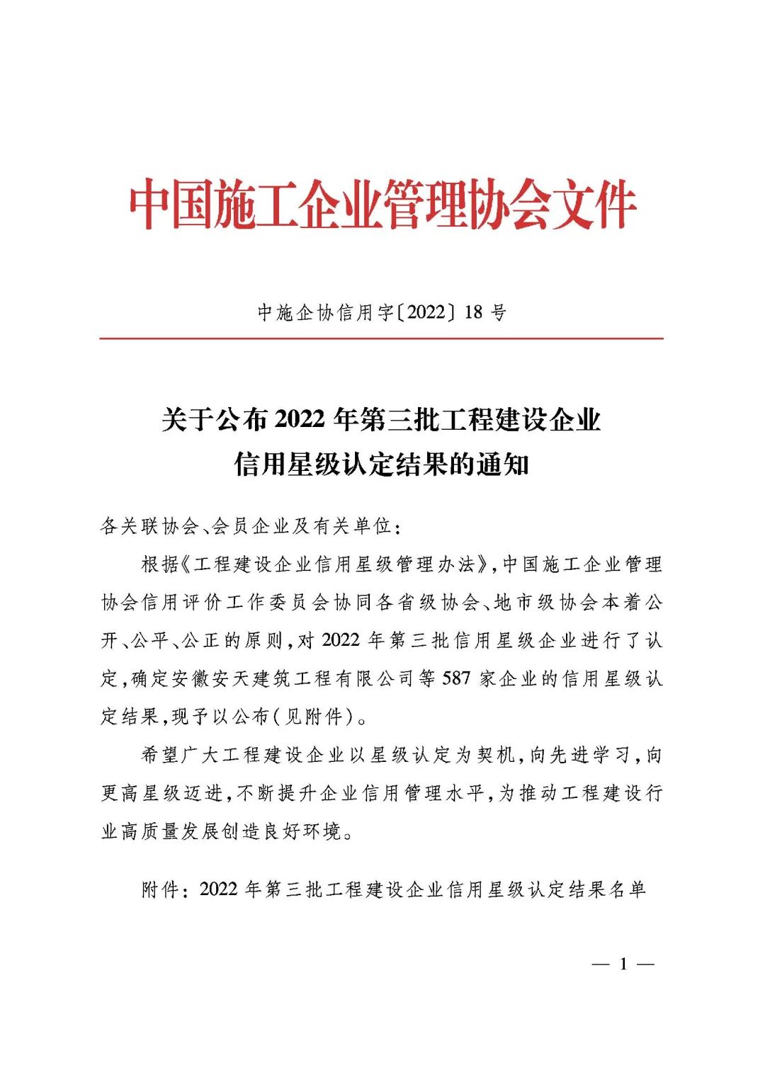 近日,中国施工企业管理协会公布2022年度第三批工程建设企业信用星级认定结果,福建一建火必注册官网凭借良好的企业履约行为和信用表现,再次顺利通过中国施工企业管理协会考核认定,并晋升为6星信用企业。