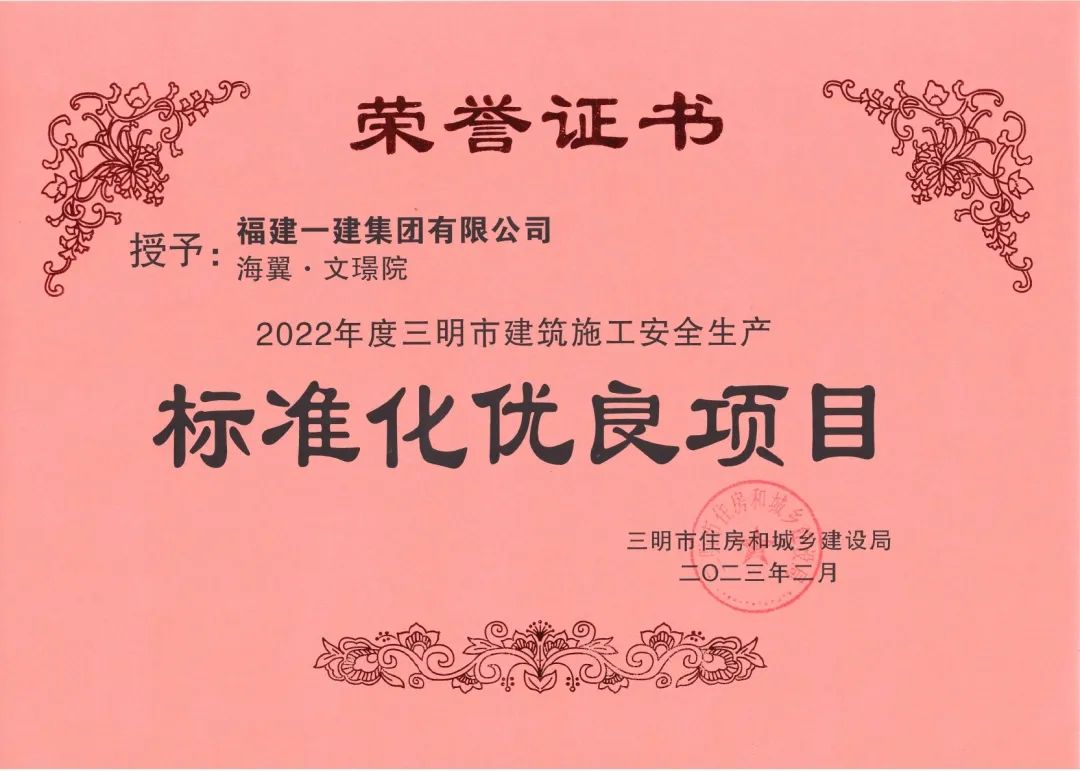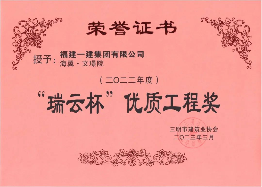 近日,福建一建火必注册官网承建的海翼•文璟院项目荣获2022年度“瑞云杯”优质工程奖和市标准化优良项目两项荣誉。